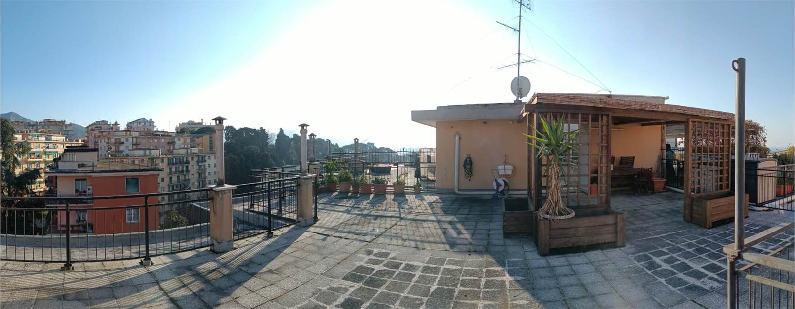 L'appartamento, posto all'ultimo piano di un palazzo moderno e servito da ascensore, è così composto: Ingresso, sala, cucina, camera, bagno, dispensa, due balconi di 10 mq (cucina e sala), un terrazzo soprastante di 89 mq e una cantina. Il caseggiato dispone inoltre di alcuni posteggi condominiali.